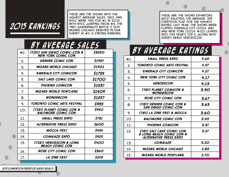 When you buy the FULL REPORT, there are rankings for each show, with NYCC, Denver and Emerald City staying strong. Wizard World Chicago also had strong sales, backing up what I always hear anecdotally. APE fell quite a bit from last year, due to the new location, and MoCCA Fest remains problematic—the table costs are so high that’s it’s very hard to make money even when your only costs are a MetroCard. Each show was ranked on sales and popularity and thus came the SUPER RANKINGS: