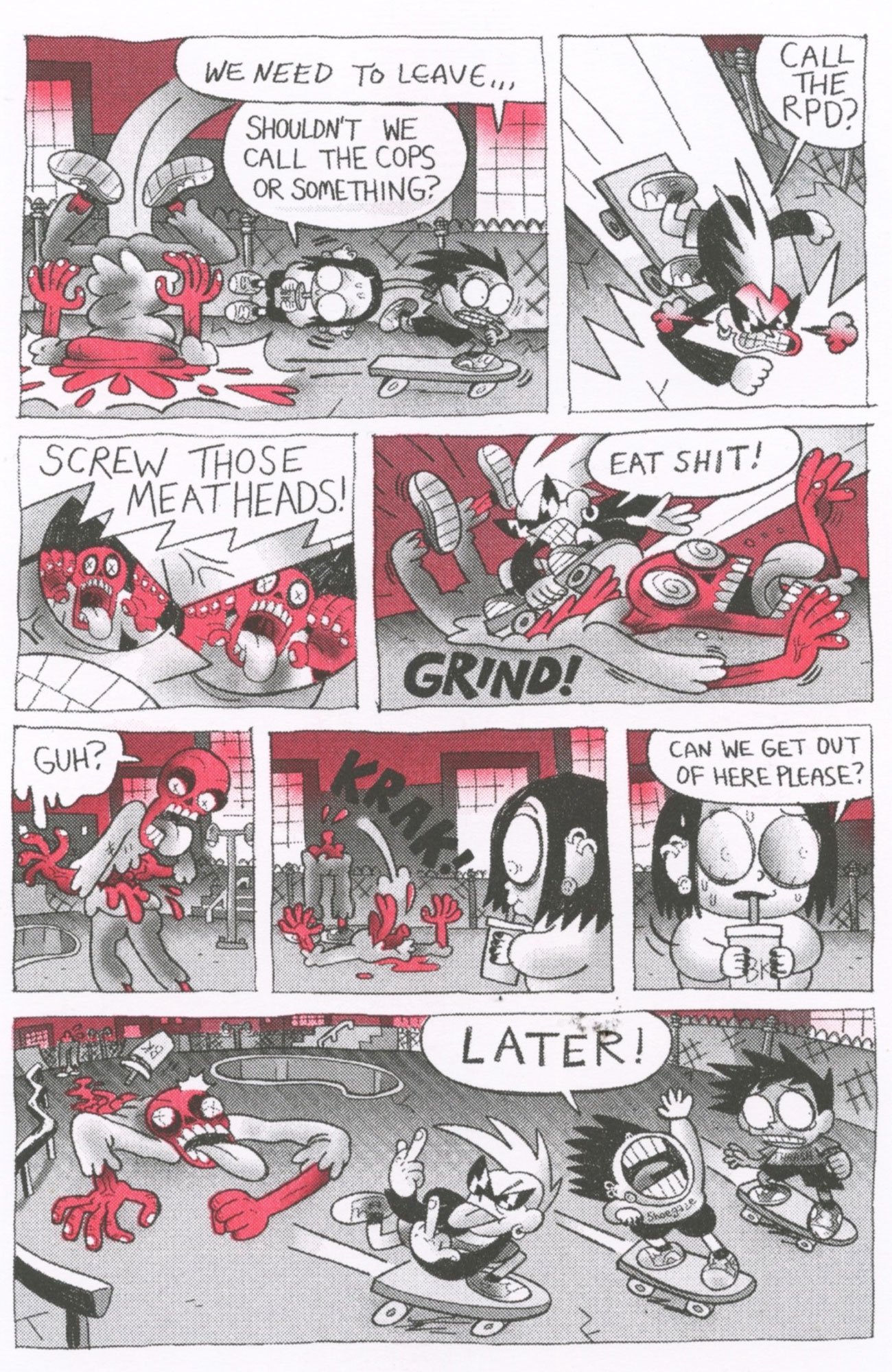 ARPAD OKAY: Raccoon City Punks by Dave Scheidt and Sean Mac. A Riso-printed, self-published RE2 fan comic you’ve got to order straight from the boys. Goofy and goopy like a Mad Magazine gross-out gag, Nickelodeon-coded artwork in an old school vein. Skate kids dodging zombies, devil dogs, Mr. X, or worse yet, Leon. Puking up ice cream and searching for animal chin. A deep left field pull for the dedicated Capcom head in your life.