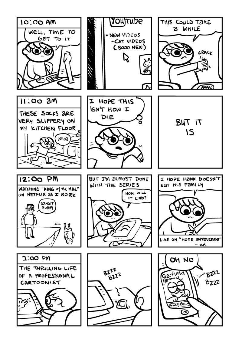 Yesterday was hourly comics day, John Campbell’s deviation of the 24 hour comic concept originally founded by Scott McCloud, which is a Ronseal sort of deal with participants producing a comic every hour. Most people tend to plump for a narration of what’s taken place in their lives over the hour just passed, which I think is pretty brave: if I did that, it would just consist of me eating, reading and writing. I guess that’s what differentiates artists though- their ability to eke something interesting from the most banal of material. Here’s a round-up of my favourites for this year- click through to the links to see the full set of comics.
