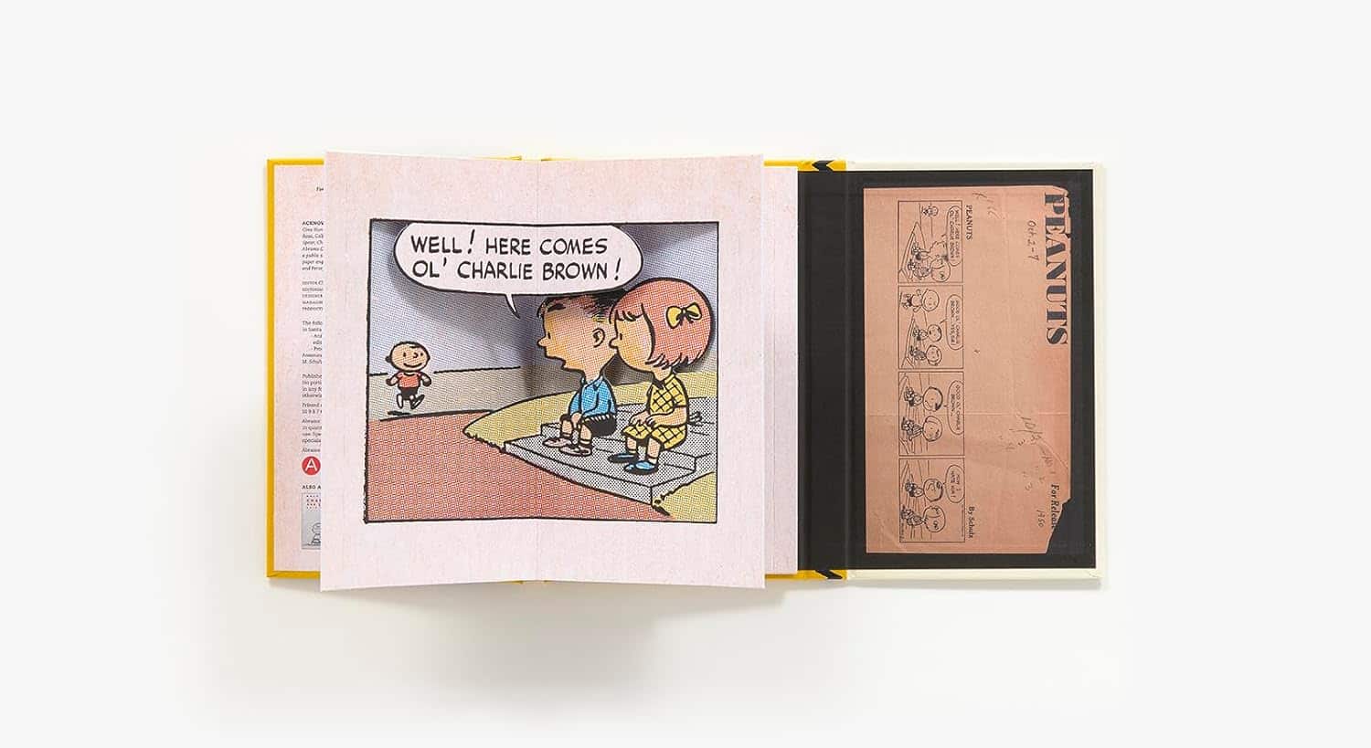 Here Comes Charlie Brown! A Peanuts Pop-Up came out last year from Abrams. Designed by comics historian Gene Kannenberg, Jr., it contains a scant 12 pages. Each panel of the strip is presented as a pop-up crafted from thick cardboard, allowing us to see inside it and around it. The finished volume is sturdy and feels nice to hold. A copy sits near my desk right now and gives me joy whenever I look at it. It would make a fine present for anyone who likes comics, or pop-ups or both.