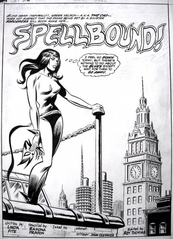 While looking for art to go along with this, I found two pages from The Cat #5, which was never published. The book was written by Linda Fite, another pioneer who must have faced incredible odds. The fact that issue #5 never even saw print speaks for itself…and that no one ever thought to put these beautiful pages out there is another robbery.
