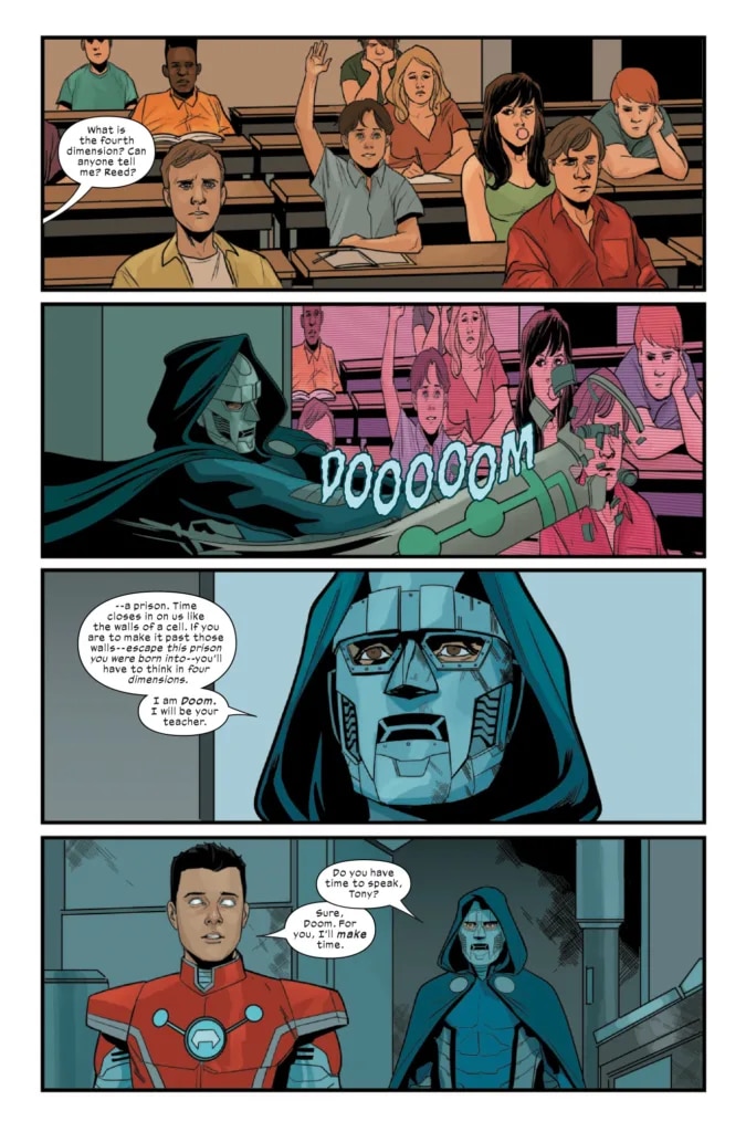 No one in comics is better at the subtle nuance of facial expression and body language than Phil Noto. As good as the series’ regular artist is, these Doom-centered issues demand a touch of subtlety and precision. Doom must sell his years of pain with nothing but a glimpse of his eyes, the turn of his head or slouch beneath his cape. Noto’s choice of color is notable as well, the issue is largely washed out, with monochrome blues and grays capturing the hopeless mundanity of Doom’s daily flagellation. In the end, it is a gash of bright red from an unsuspecting colleague that snaps Doom out of his torpor, bringing unexpected warmth and light slashing through his gray world.