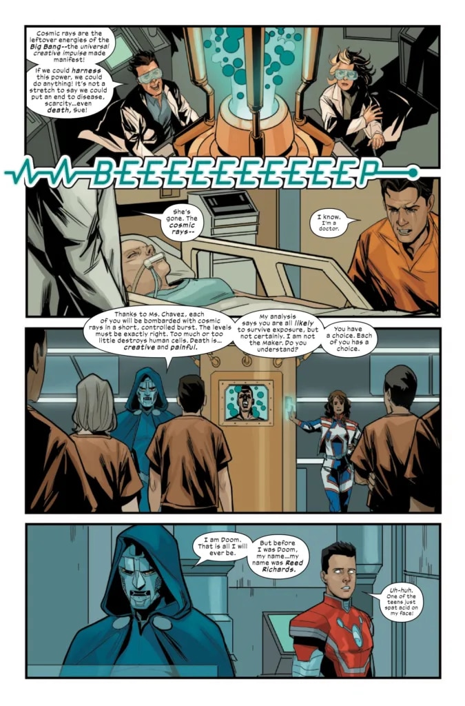 Through Doom’s harrowing journey of loss, torture, self-loathing, and grief, all existing on the page at one time, Camp and Noto make physical the sensation of memory and perception of past and present as a single unit that defines us with every breath. It is one of the beautiful things comics allows, this juxtaposition of time. We see cause and effect simultaneously. The past is always right there, as real as the panel in front of you. VC’s Travis Lanham’s lettering smartly and subtly transcends the panels and timestreams, intercutting the multiple narratives on the page and forcing the reader to absorb the multiple stories as a single unit, even on second or third readings focused on individual moments, as the balloons float over multiple panels.