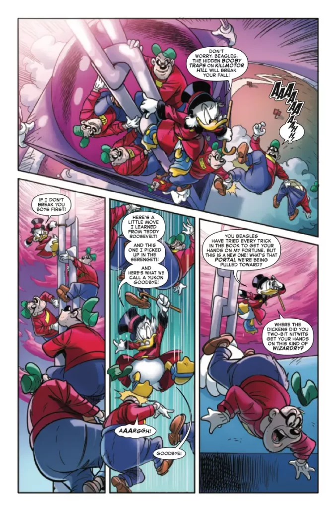 Not having previously read much Scrooge McDuck, Aaron’s narration provides a voice I remember not from any one story, but rather as an incorrect amalgamation that feels correct for this particular plot. What also feels innate to this brawl for all is the wide array of artists working on different parts of the same issue! Having four different art teams draft and illustrate the same story is a testament to their style consistency, however it makes it more readily apparent how differently each team approaches a panel layout! Let’s investigate: