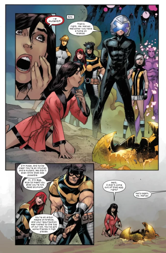 The Fall of X kicks off with the resurrection of Ms. Marvel and the revelation of her mutant identity (which makes the recent memorial issue moot) and things only gets crazier from there. I want to point out up top that, for those wondering how Kamala was able to be a mutant during the time when Terrigen Mists were deadly to mutants (and are mid-comment)…. they fix that here.