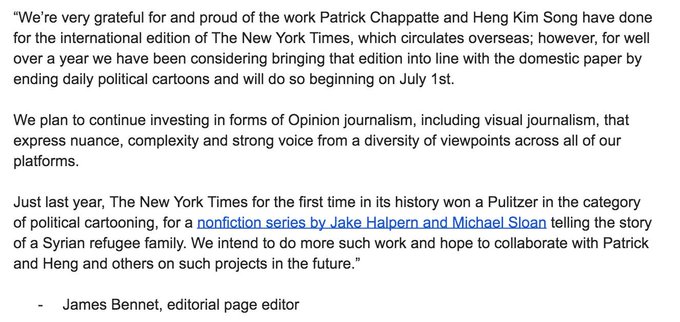 While many alternative venues for editorial cartooning – such as The NibThe Nib – have sprung up in recent years, the power of the Times as a platform can’t be underestimated, and giving up on editorial cartoons entirely seems like an odd move.