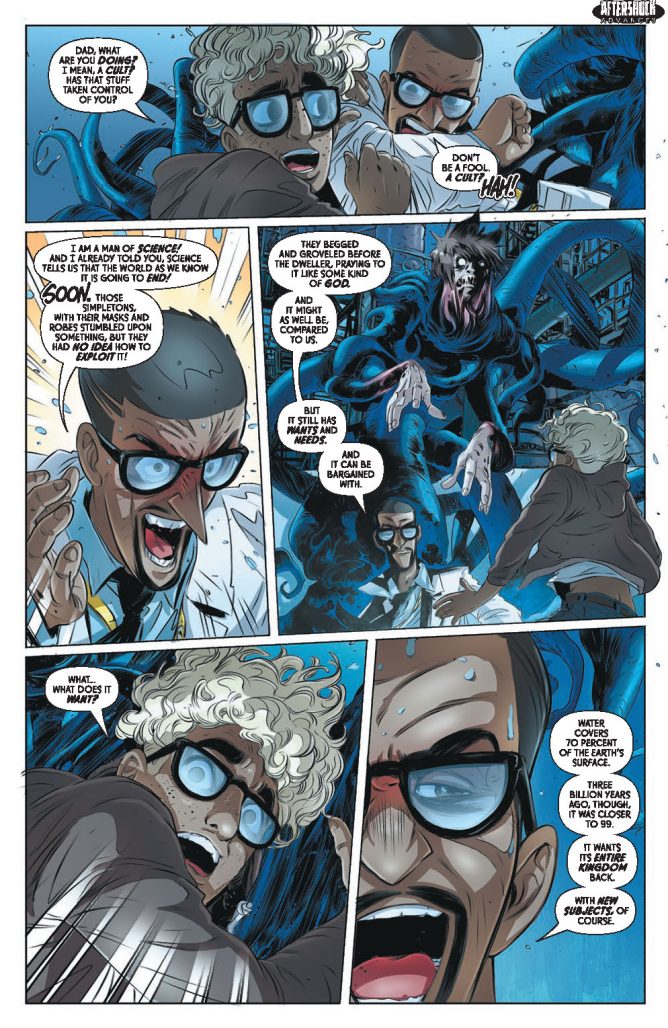 Next week AfterShock Comics will release The Ocean Will Take Us #5. The final issue of the adventure horror series comes from writer Rich Douek, artist Carlos Olivares, colorist Manuel Puppo, and letterer Dave Sharpe. Today The Beat is pleased to present a preview of the issue, which finds Brian and his friends in way over their heads.