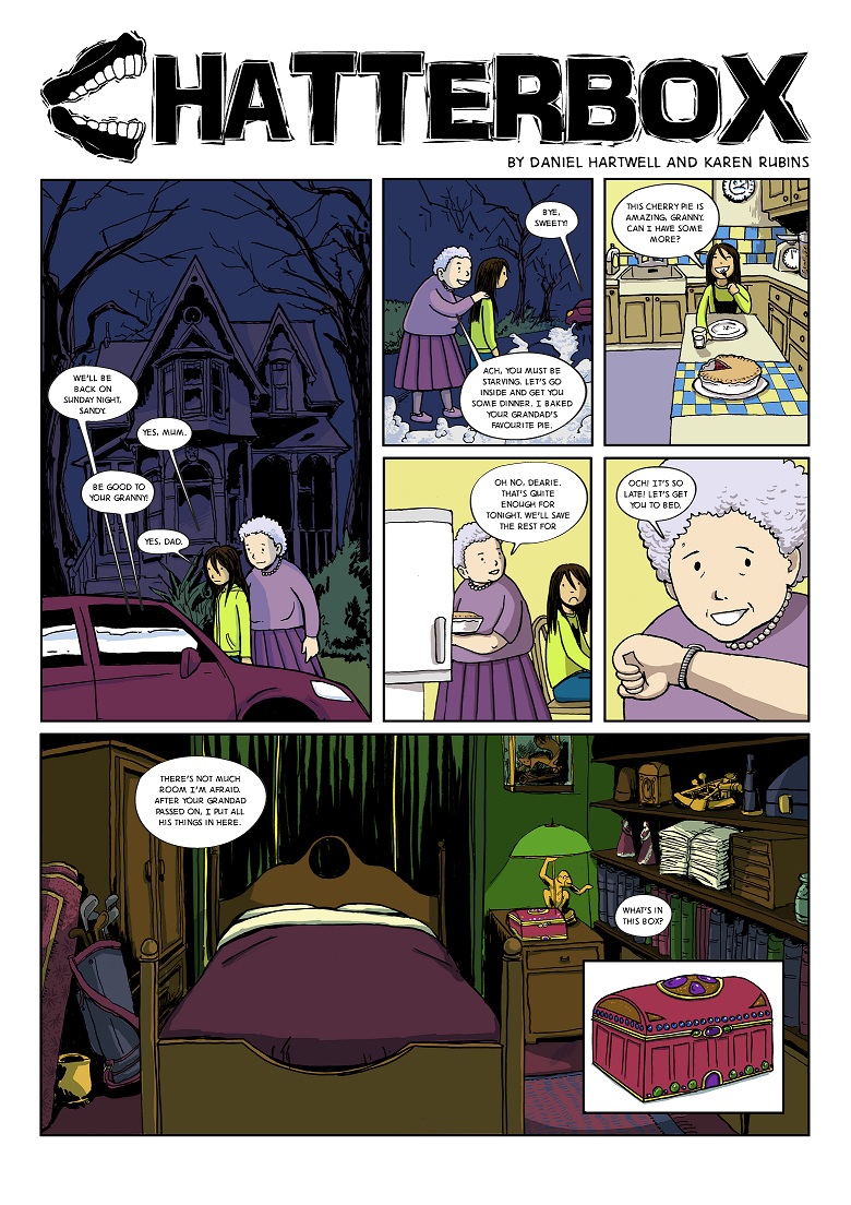 Daniel: Karen and I met for a brainstorming session in the British Library. We came up with lots of different ideas for stories including Chatterbox that day. Though the title only hit me on the way home. I texted it to Karen straight away and she loved it.