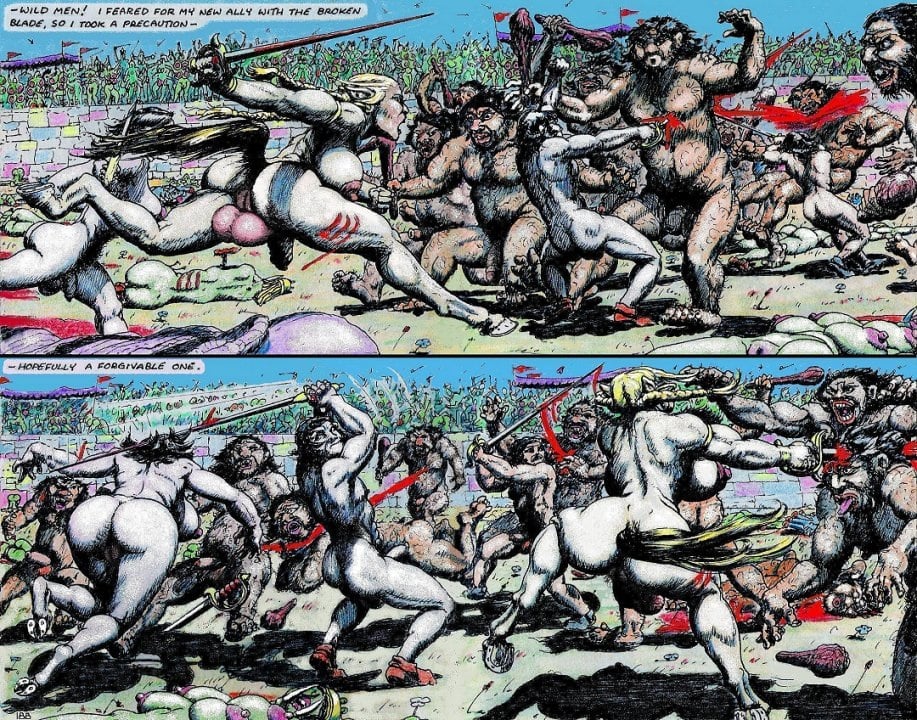 Since I was drawing initially for my own amusement, with no thought of publishing, I pulled all the normal stops and drew the way I imagined the classic story to be written. The characters are highly underclad, yet oblivious to it; it’s their normal way, and they don’t see much naughty or titillating about it. The men are men and the women are women and blood is red and scary. I set out to be honest with the nudity and violence, and the devil take Pollyanna, she needs to grow up anyway. A lifetime would be required, in full-sized oils of five thousand panels to truly do justice to the story. I can’t spare that, but I hope you will find the little scenes that I have captured to be at least somewhat rewarding and enjoyable. You may notice that the captions are paraphrased in places for the sake of brevity, clarity and fluidity, and hope no one minds me taking this small additional liberty. I hope you enjoy it, and thank you.
