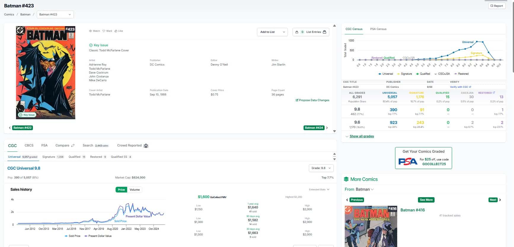Batman #423 is one of the most collected Batman covers. The comic itself goes for $1,500 on average, graded at 9.8.