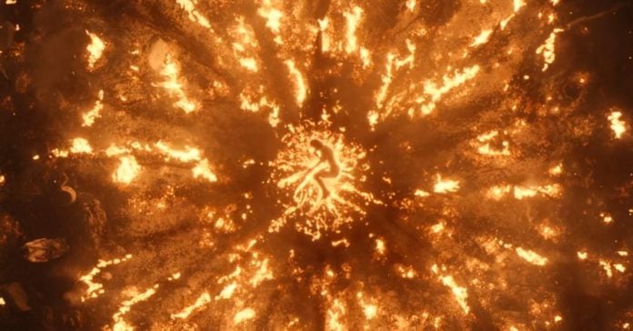 FINAL MEANWHILE, Sadoc is poring over a giant book of lore and facts – a clear precursor of the Red book of Westmarch, a book of Hobbit lineage and records – when Nori and Poppy spy a giant meteor hurtling through the sky – and so does everyone else in Middle earth, from Galadriel out at sea to Elrond and Gil-Galad. Approaching the site of the meteor landing, there’s a mostly naked man in the middle….and the whole thing looks very much like the Eye of Sauron from the Peter Jackson movies, with echoes of Sauron’s sigil.