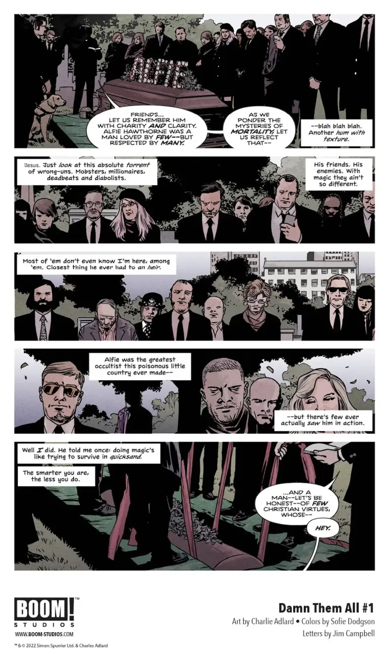 Simon Spurrier, who co-created this series with illustrator Charlie Adlard, is no stranger to weird comics, or even demon-hunting magic worlds. Having written crime novels, Judge Dredd comics, and a run of John Constantine: Hellblazer, Spurrier has a huge amount of genre and traditional story tools to make this volume really solid structurally. One of my favorite things about reading it all in one whack of pages is: it reads like a grimoire at times. There are action scenes, there are detective-ish insights, there are demons and magic and legend. But the special sauce is all of the small hints and influences inside of the text. The casual-magic life, the stoner-esque scholars, and the encyclopedic entries about new demons or lore-flavor that interrupt scenes are a big aspect of what makes the world feel whole.