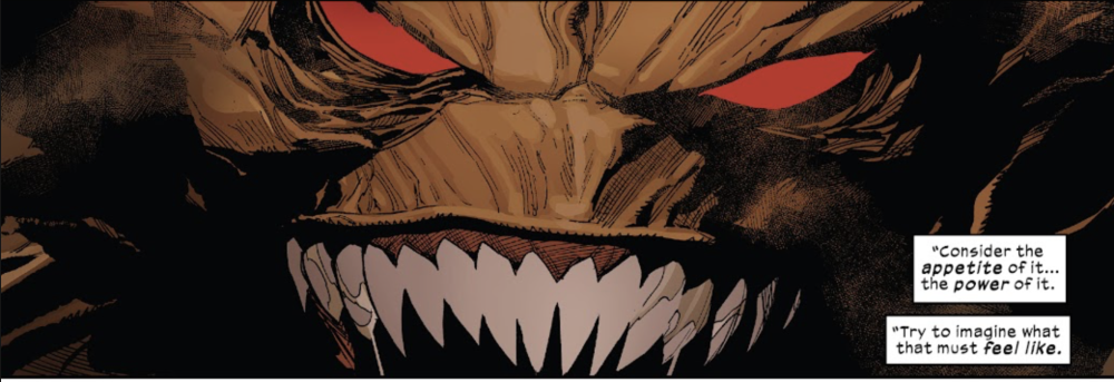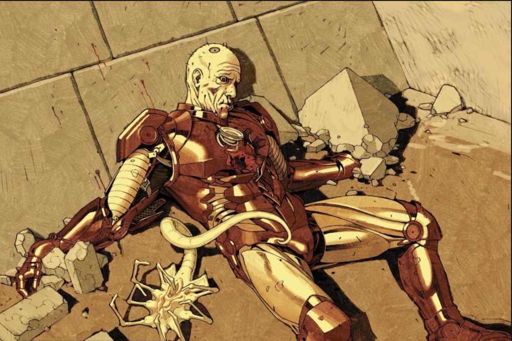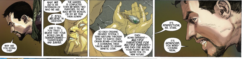 Ironically, it’s Mister Sinister — a man who claims to represent evolution — who seems to represent the old ways of living. If the aliens here represent a regressive thought that pushes humanity away from any hope of continuance, Mister Sinister’s allegiance with them is a highlight of what he always was: a colonializing old bastard who utilizes the reactionary force of the aliens to dominate over all. A Great Man who, unlike the Tony Stark we follow, refuses to bow out and let the inevitable come. He fights death not to save people, but to prolong it for as long as possible. To defer the ending of things.