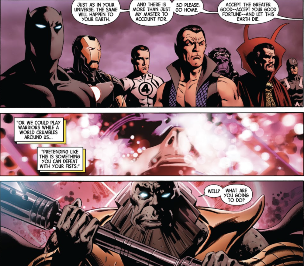 With The Avengers, Hickman explores a bleaker side of things. It breaks itself into two sides of an equation. The first side focuses on the main Avengers team reforming itself into a larger organization with subgroups within. These Avengers face off against cosmic forces that seek to change the world. Meanwhile, the Illuminati works in the background dealing with the even larger cosmological force of the entirety of the universe coming to a premature end. Being a group of great men, they have found themselves with no other option than to commit multiple genocides in the vain hope that the universe could be spared.