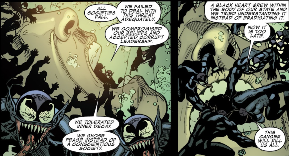 Rather, Hickman suggests that the alternative to Weyland’s Parasites is creation. As Tony notes in the comic’s closing monologue, “I spent my life building things. Creating. I suppose, in a way, that makes me the antithesis of what we face. Some vile thing that lives to infect, consume, and destroy everything we are…and everything we have made. All that humankind seeks to leave behind… made ash in the mouth of an alien parasite.” The heroes resolve to save what they can, and find a way to survive. The empires of old have fallen, the systems of cruelty that they lived under have been upended. And we are left with the only decision: Change or Die.