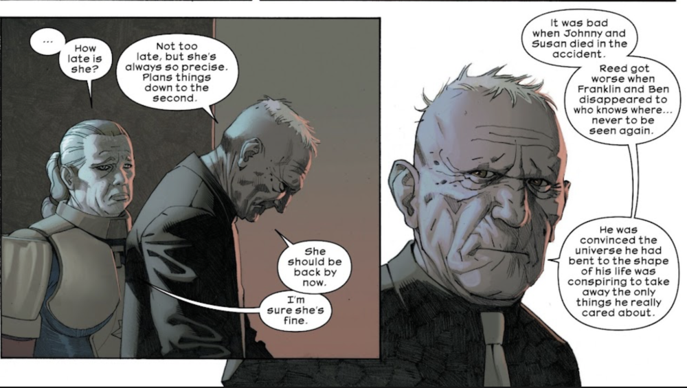 But perhaps the most relevant influence — with regards to this article — is Jonathan Hickman’s massive run on Avengers and New Avengers. As a segment of Hickman’s Fantastic Four opus, Avengers restructures the team into specific units to combat various cosmic forces. On the whole, Hickman’s Fantastic Four run deals with the implications of the failures of the previous generation on the next and how said generation must evolve through these failures and how much responsibility the previous generation has to aid their children. As the Wizard, a significant villain of the run, puts it in his first appearance in the run, “Is there anything more disappointing to a creator than the failure of his creation? Why is it that my sons so thoroughly fail to please me? It is all so very disappointing. I know that a father is supposed to unconditionally love his children… But I can only find room in my heart for you and your current generation.” It is this thematic core that connects Hickman’s epic to the late era work of Ridley Scott in his bleak and pessimistic work such as The Counselor or Alien: Covenant. (Though not as aptly a line as “Is it playing God if you’re truly serious about creation? No, it’s not.”)