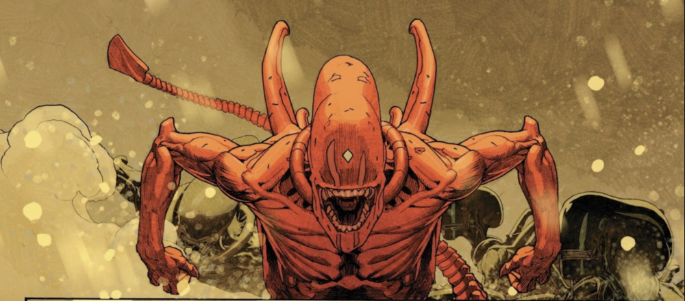 The problem is that Aliens vs Avengers is not an Aliens story. This is plainly seen on both the artistic and script writing fronts. Artistically speaking, Esad Ribić draws the cosmos with a harsh edge. The colors Ive Scorcina provides are not the warm blues of the opening shot of Aliens, a cosmic swirl of oceanic delights. But rather a bleak darkness. When there is light from the stars, it’s a piercing brightness like looking into the sun. Even the action sequences are not the thrilling adventure fare typically seen in superhero comics or military science fiction.