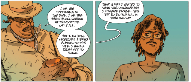 But an artist embarking on this journey must make some sacrifices and therefore Mohan has essentially entered a Faustian bargain, trading his soul for the pursuit of meaningful art. However, the negative connotation of this exchange is not where V and Andrade go. Rather, Rare Flavours is about the necessary sacrifice and labor inherent to acts of creation. Art is a reflection of our consciousness, and thus our pain, our history, our expectations are what pour into the work. Our lived experience and life is the flavor behind each dish, and as time goes on the work it takes to produce these meals becomes more and more difficult.