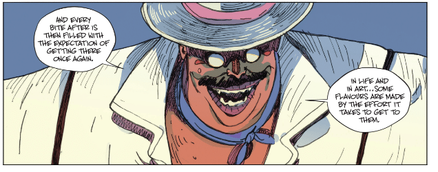 This love of food, and its expression as both a love of art and a eulogy to artisans whose craft has been crushed under the heel of capitalism is at the heart of Rare Flavours. The book reteams Ram V and Filipe Andrade who previously created one of the best comics of the decade in The Many Deaths of Laila Starr. Here they once again combine grand themes of humanity’s purpose with hindu mythology to take the reader on a journey through the various dishes of Indian cuisine. Their combined efforts creates one of the finest comics of the year, an aesthetically and emotional complex tapestry that helps us understand not only food, not only art, but the humanity inherent to acts of creation, and how, or if, that can be reconciled with an automated, industrialized world of destruction.