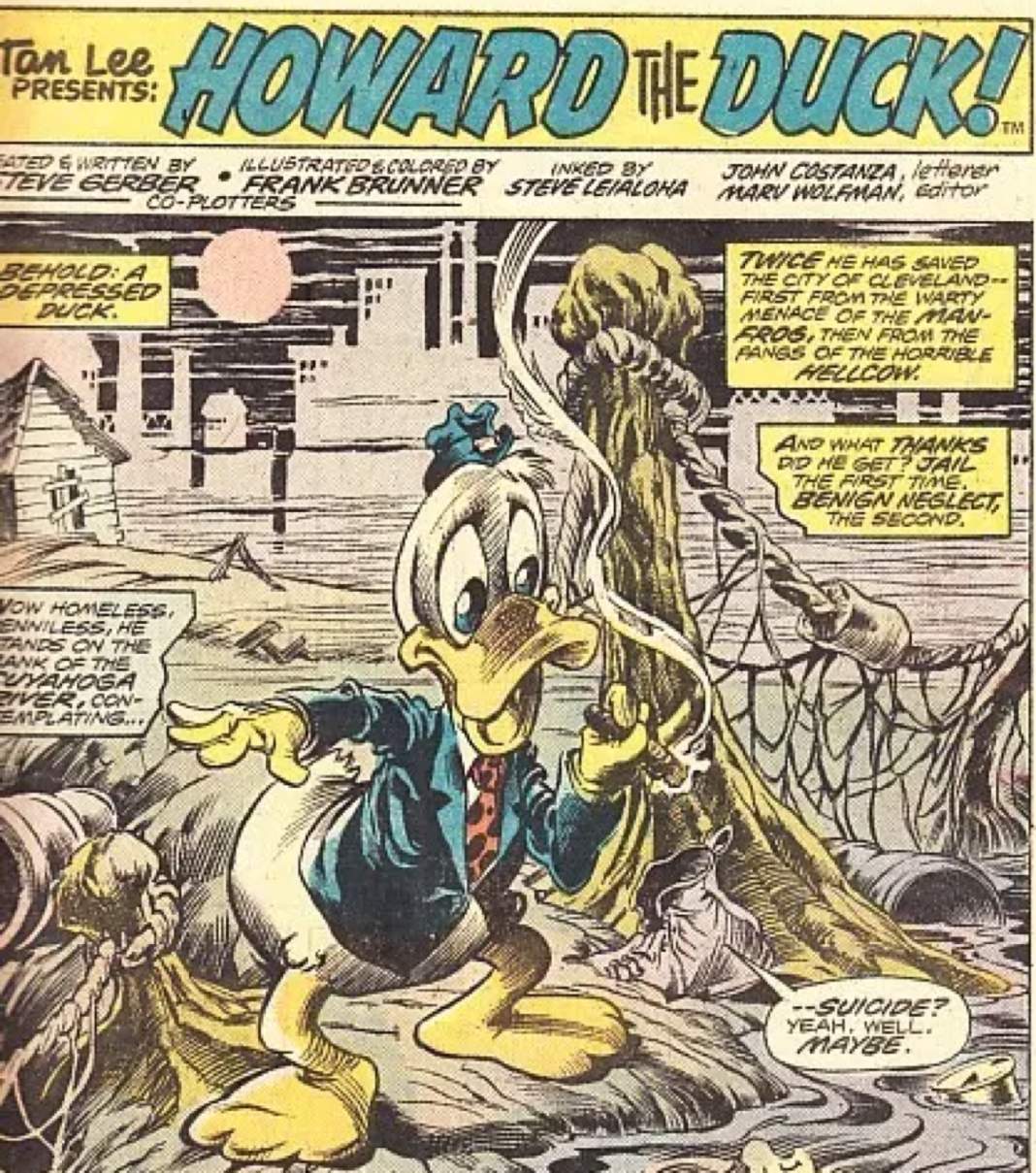 Howard the Duck, of course, was his signature title, simultaneously parodying superhero comics and the funny animal tradition. Howard was the foul fowl that Donald and Scrooge could never be, having carnal relations with a human, smoking cigars, fully aware of the fact he wore no pants. The very first panel of Howard #1 was one of many, many scenes that has remained burned into my brain all these years. “Behold, a depressed duck.” Demoralized by his journey to the world of the hairless apes, far from home with no way back, Howard was contemplating suicide by jumping into the polluted waters of the Cuyahoga River. From there it was a picaresque satire of pop culture and human foibles. Howard battled the bland, the greedy, users and exploiters. The villains were ordinary creatures—transformed as so often in comics, into demon cows, killer turnips—or else crazed wackos with their own chaotic agendas—the Ringmaster, Dr. Bong or, on one memorable occasion, a supervillain called the Black Hole, who when using his powers would be at the center of a full on Kirby-esque panel with the giant caption, “The Black Hole sucks!”