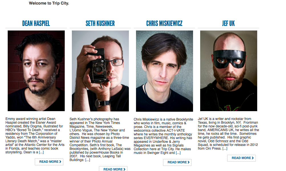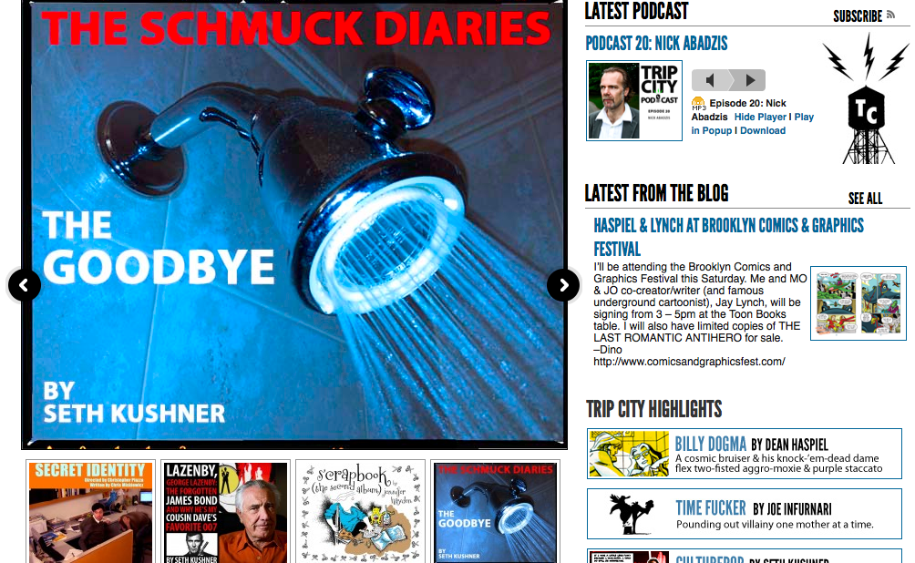 During its first year, TRIP CITY showcased regular free content including Haspiel’s essay/prose series Room Tone and his comic The Last Romantic Antihero, Kushner’s comic Schmuck, his photocomix profile series CulturePOP, Burandt’s single-panel series Time Bum and Clash Fiction essays, Miskiewicz’s essay series Signals, Infurnari’s comic Time Fucker, Hayden’s comic strip S’Crapbook, Abadzis’ single panel Subterranean Stories, Beasley’s prose series Modern Alice, DelSante’s crime prose Steel City Noir, and the TRIP CITY Podcast, which has included such notable guests as; Michael Moore, Henry Rollins, Miranda July, Jonathan Lethem, Bob Fingerman, Becky Cloonan, Lizz Winstead, Chuck Klosterman, Daniel Johnston, and more.