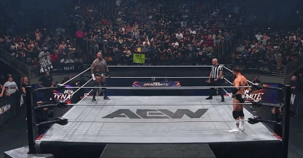 AEW Dynamite’s February 5th show at Las Vegas produced one such chant, one that was infused with a political force that rarely gets the time to build an take over the entire audience live on TV. In the opening seconds of the show’s main event match between Brody King and the champ MJF, the crowd let out a crystal clear “Fuck ICE” chant that made MJF break character for a bit to acknowledge the moment.