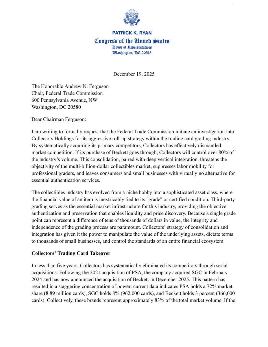 ”Collectors have consolidated over 80% of grading volume, leaving only one independent competitor. Collectors’ dominance is compounded by vertical integration; it controls grading capacity, pricing analytics through CardLadder, and participates in buying and selling graded cards — creating severe conflicts of interest,” wrote Congressman Ryan.