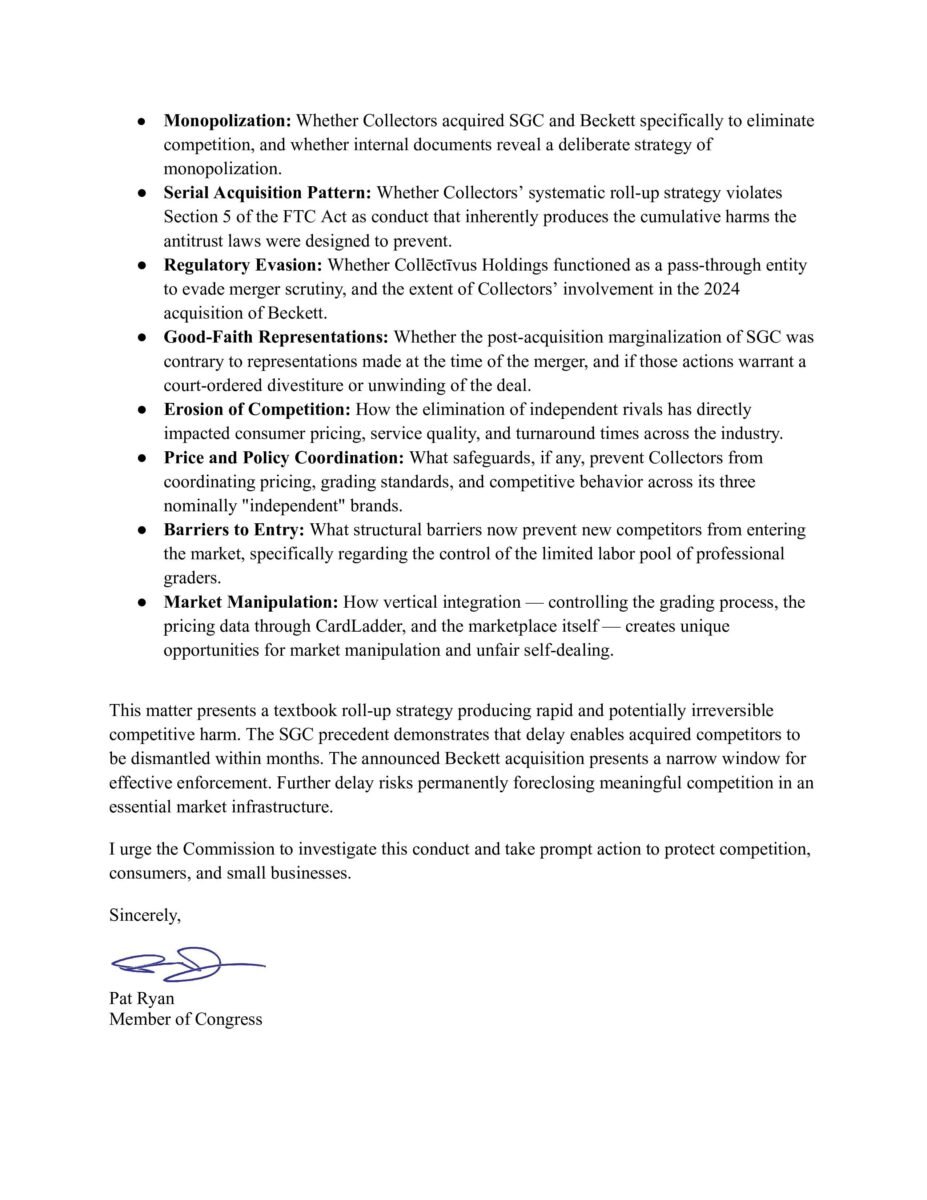 In the letter, Ryan asks the government to look into allegations of monopolization — “Whether Collectors acquired SGC and Beckett specifically to eliminate competition, and whether internal documents reveal a deliberate strategy of monopolization” — as well as whether Collectors’ aggressive series of acquisitions was designed to evade merger scrutiny and avoid regulation. He argues that the end result of such “erosion of competition” will be to drive up prices and create almost insurmountable barriers to entry for potential new competitors.