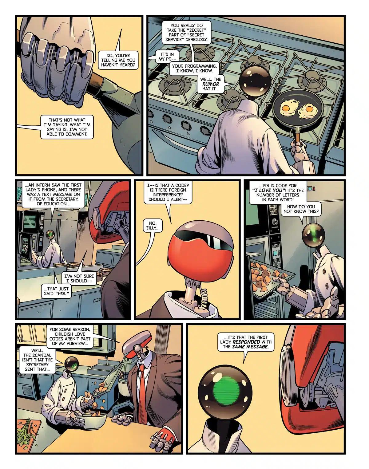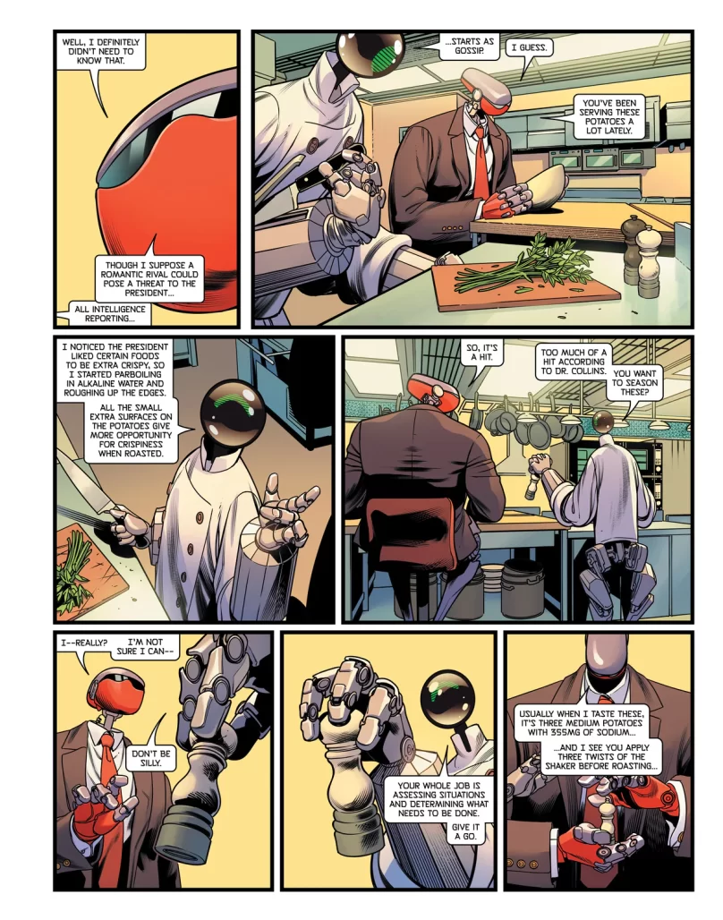 So yeah, much to my surprise, White House Robot Romance #1 is actually a really thoughtful treatise on AI, global relations, and where the lines between human and non-human both start and stop. Aside from the dual leads (our titular White House robots in love), there’s an interesting cast of characters, including dissidents, artists, and one very grumpy West Wing waiter who’s just doing his job, at least partially on account of his ex-wife. And the creative team does a fantastic job sewing it all together into a really tense, coherent first issue.