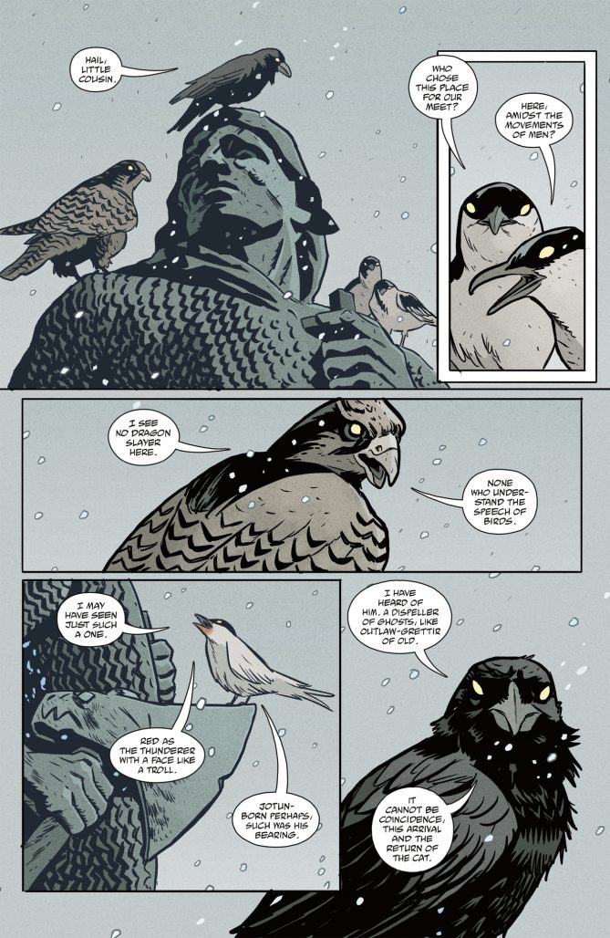 Mike Mignola set the standard from Hellboy’s first issue on regarding the treatment of folk tales and how they should be allowed to be bring in every single bit of their wonder and their horror along with them. Yule Cat is no exception. Smith does a great job of capturing this by illustrating the titular legend in a range of styles that comes off more interpretive than definitive. The cat looks regal and even adorable in some instances only to bear its fangs and turn into a dark and deadly creature the next. Smith makes sure every element of its founding story reaches the surface and it makes for a visually stunning battle in the final stretch.