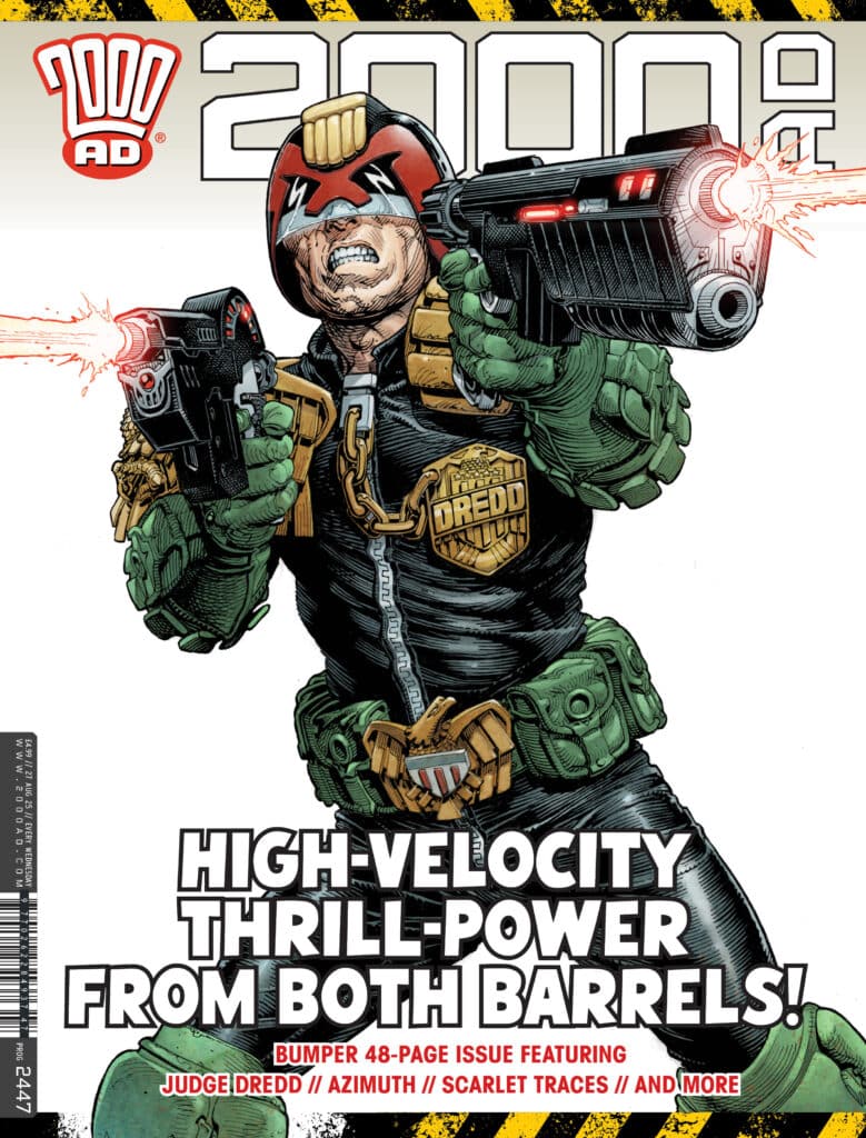 2000AD 2447 (Rebellion Publishing): This week’s Prog is a bumper issue, and as such, it intermingles easy jump on points with continuations of ongoing strips. And, I’m happy to say, the new stuff is all stellar, particularly the artwork. The lead story is a standalone Dredd outing called Judge Dredd: Free Cherese by writer Geoffrey D. Wessel, artist Nick Roche, colorist Jack Davies, and letterer Annie Parkhouse. Roche’s take on Dredd is really great stuff, with clean lines and hard-hitting panels when needed (I think one panel of Dredd kicking in a door actually shot some splinters out of my tablet). The story is good too, but the artwork in this one is just a pleasure. My other favorite this week was Herne & Shuck: Be Here Now by writer David Barnett, artist Lee Fillmore, colorist Gary Caldwell, and letterer Simon Bowland. It can be read as a standalone story, but it also puts some plot pieces into place that seem certain to be revisited at some point. Moreover, these characters are great, the writing of them is fun, and the story has a nice, tight structure. All in all, a solid bumper issue. This week’s cover (above) is by Cliff Robinson with colors by Dylan Teague. As always, you can pick up a digital copy of The Prog here. —Zack Quaintance