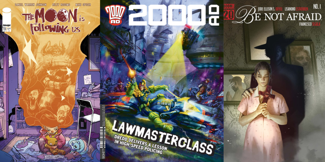 This week’s Wednesday Comics Reviews column features a finale issue with The Moon Is Following Us #10, a debut with Be Not Afraid #1, and more. We also look ahead at a new title eligible for pre-order, Sisterhood #1. Plus, as always, The Prog Report!