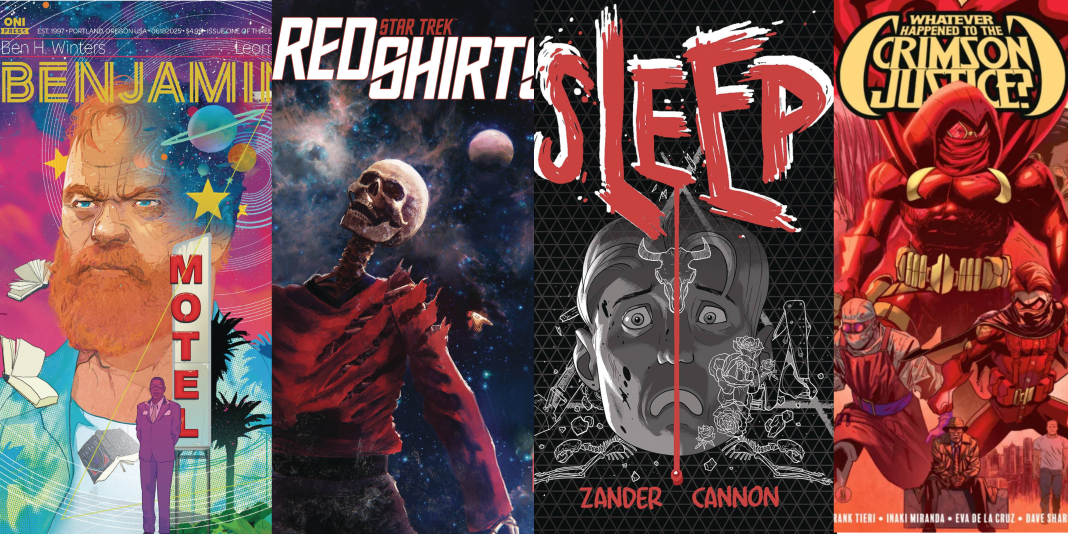 Sleep #1 (Image Comics): Zander Cannon, best known for his work on the cult favorite story of the monster prison island Kaijumax, is back with a new offbeat horror mystery series. This first issue is a slow burn, an introduction to a small, quiet town and its unassuming inhabitants who are being haunted in the evening hours by something…monstrous. But our lead, Jonathan is completely unaware of the loud cries in the night. He awakens at the start of the issue, his house a mess, his cat missing, completely oblivious. Cannon’s art, all gray scale save for a pop of red here and there on various objects and small details on each page, sets the tone right away. The artwork is cartoony but the grayscale and pacing give a Lynchian discomfort. Things are too tranquil here, it is at odds with the moody noir monochrome. The small red detailing is a jolt of contrast that makes you question every item that appears in color. What do they mean? What message do they send? The religious imagery and Jonathan’s relationship to his church even as the horrors creep in around the edges, the mundane every day routines that these characters carry on, make the hints of the macabre all the more eerie. You could read this book and come away, unfairly, feeling that nothing happened. But Cannon is laying groundwork and backstory to an unfolding mystery about the dark nature of this too-perfect little hamlet and its people. The final page makes clear that this peace won’t last long, and that revelations will not be far behind. —Tim Rooney