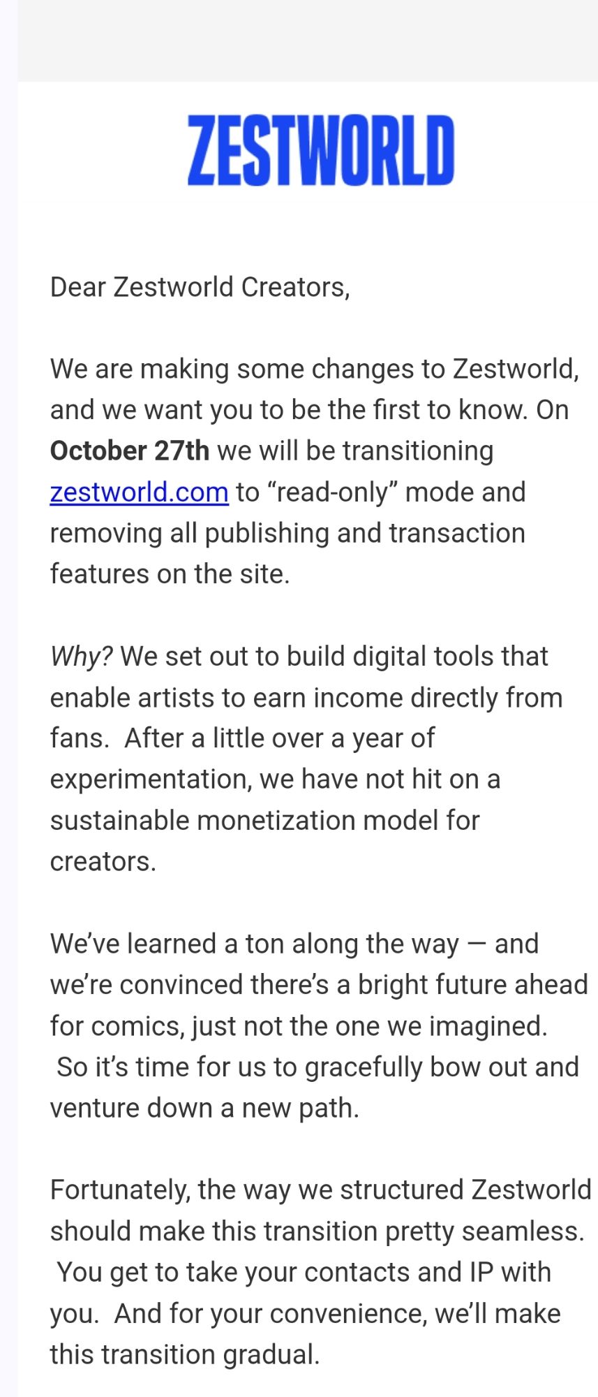 However, while I was researching this story I did some googling and found an actual announcement of sorts. In October 2023, in a BlueSky post by Ben Guilfoy he casually mentioned that with Zestworld closing he was moving his efforts to Patreon. He even screenshotted an email he’d received:
