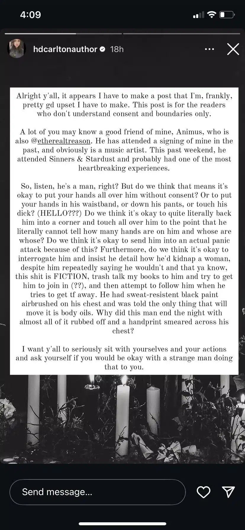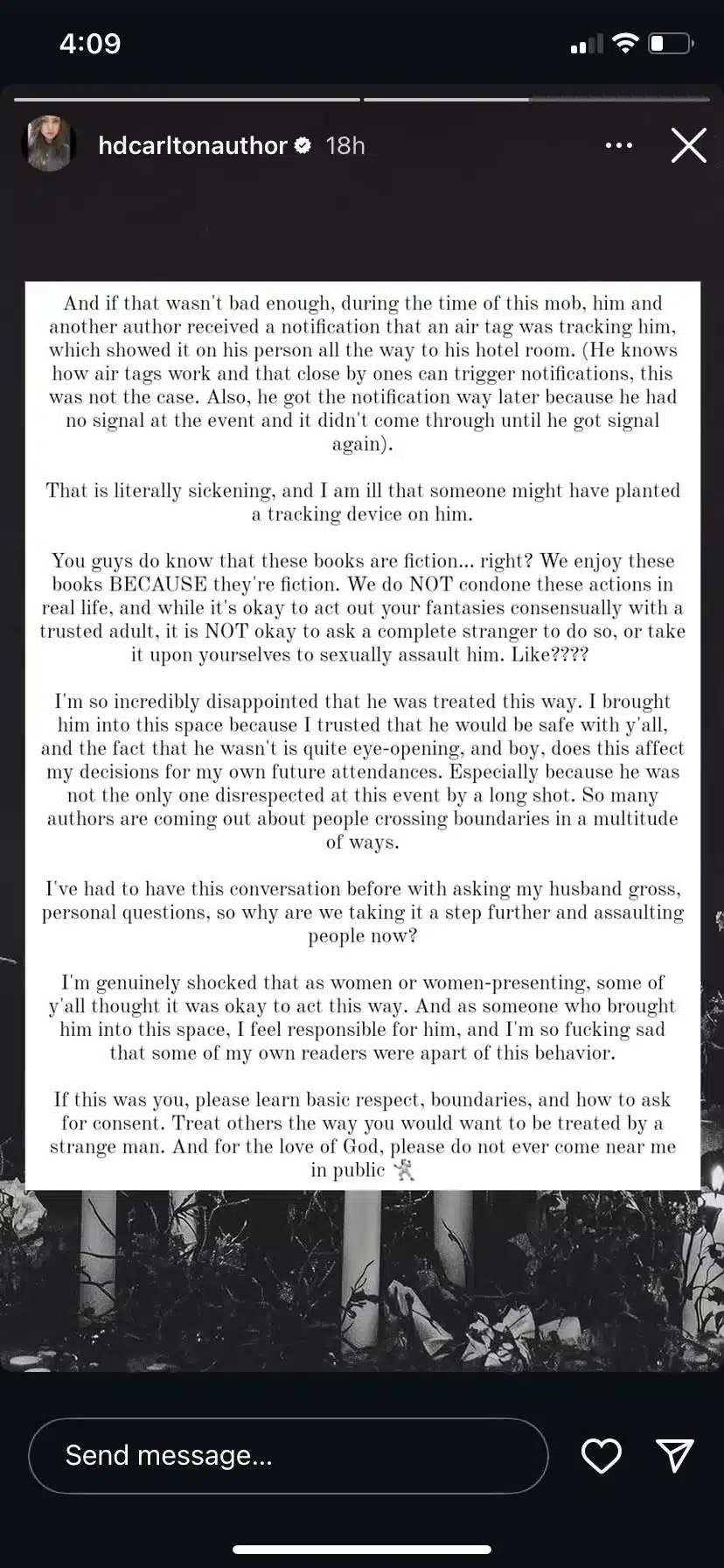 I did pick up on the fact that “when a con is crap” seems to have befallen several other bookish events of late. There were allusions to other disasters – a Bridgerton Ball in Detroit last year went viral when it didn’t have enough food and other flops – and this very same weekend, Sinners and Stardust, a con devoted to dark fantasy, had another set of problems. Here’s a relevant Reddit thread. Although the show was planned to highlight spicy, dark romance, some people took this too far, including groping (really assaulting) a male cosplayer as posted in an IG story by author HD Carlton: