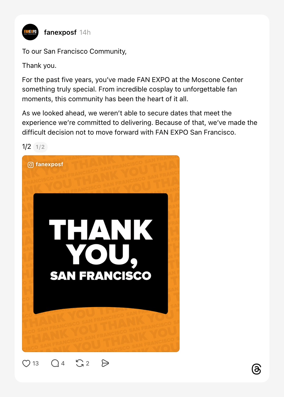 As we looked ahead, we weren’t able to secure dates that meet the experience we’re committed to delivering. Because of that, we’ve made the difficult decision not to move forward with FAN EXPO San Francisco.