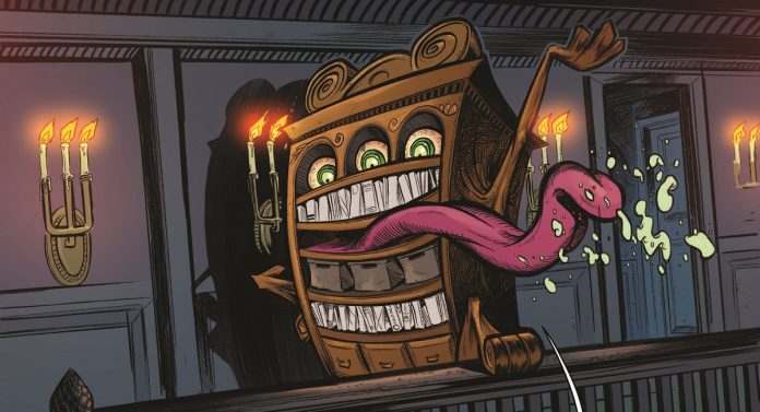 A group of teens stumble into an old creepy house, and come across an anthropomorphic Comics Bookcase. They are terrified, but the Bookcase doesn’t realize it…and just starts telling stories, taking us into our other short comics. This main Comics Bookcase story is by the creative team of artist Ryan Lee, colorist Doug Garbark, and letterer Shawn Lee, the same team from the excellent and underrated, Mountainhead.
