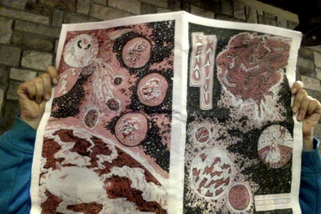 Xeno Kaiju is a tabloid newspaper/mini comic by Philly artist Pat Aulisio. It consists of sixteen newsprint pages featuring a single panel on each page. Published by Hic and Hoc, an indie comic publisher based out of New Jersey, the comic has been finished in black and white, with the exception of its cover and center splash page, which includes a warm rose.